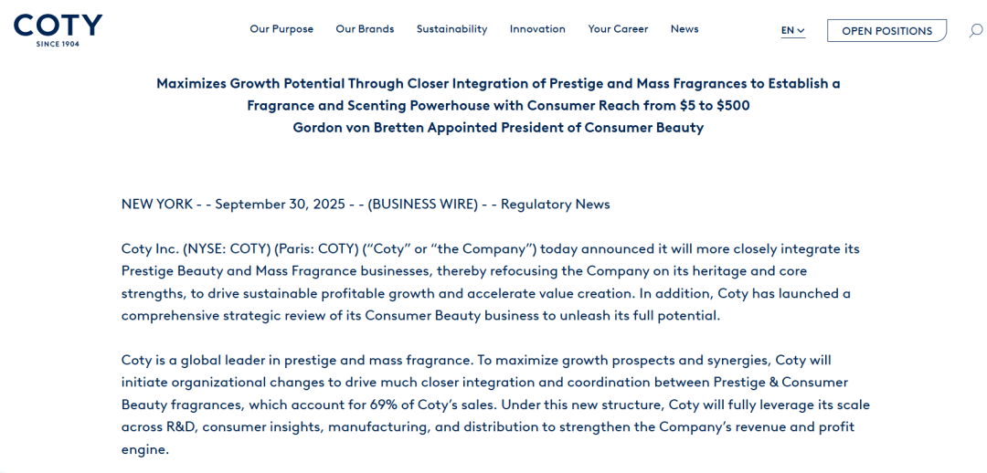 近日,百年國(guó)際香水美妝巨頭科蒂于官網(wǎng)發(fā)布正式公告,宣布已啟動(dòng)對(duì)其大眾彩妝業(yè)務(wù)及巴西業(yè)務(wù)的戰(zhàn)略評(píng)估,將全面探討包括合作、資產(chǎn)剝離與分拆在內(nèi)的各種可能性。