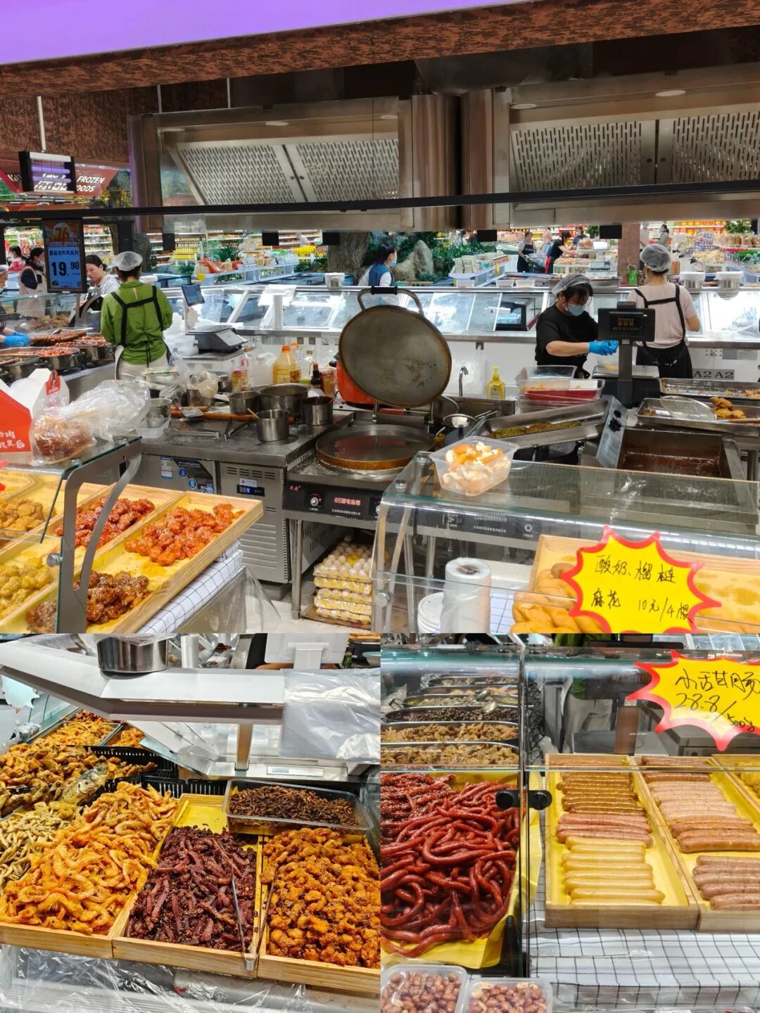 熟食品類雖僅設一個陳列島,但配套了內置操作間,員工可現(xiàn)場加工面點、炸物等食品,現(xiàn)做現(xiàn)賣。定價同樣親民,自選涼菜8.9元/500g,“爆款”小甜腸28.8元/500g,兼顧新鮮與性價比。