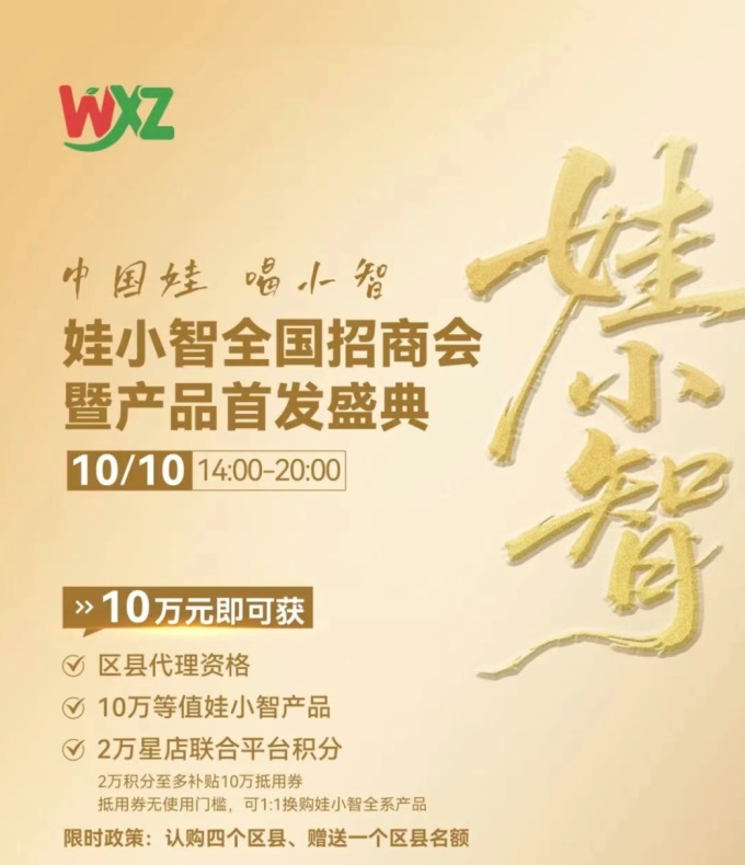 招商海報(bào)顯示,10月10日“娃小智”在杭州舉行了全國招商會(huì),購買“娃小智”產(chǎn)品10萬元以上即可獲得該區(qū)域獨(dú)家經(jīng)銷商資格。