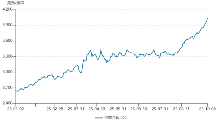 10月8日,現(xiàn)貨黃金(倫敦金現(xiàn))價格首次沖破4000美元/盎司關口,創(chuàng)歷史新高。2025年至今,現(xiàn)貨黃金的漲幅已超過53%。