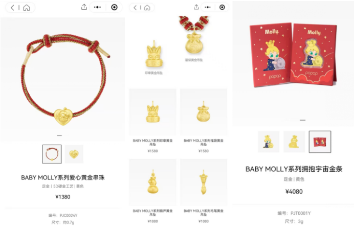 與老鋪用古法工藝增加溢價相比,popop的足金產(chǎn)品,是用MOLLY的IP價值綁定黃金的收藏、保值屬性,產(chǎn)品價格方面,同樣采取了“一口價”的模式。