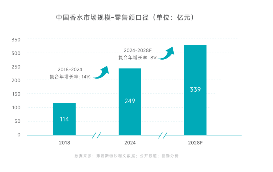 中國也有著同樣的高增長預(yù)期。德勤聯(lián)合穎通控股發(fā)布的《2025中國香水香氛行業(yè)白皮書》顯示,中國香水市場規(guī)模將從2024年的249億元增長到2028年的339億元,復(fù)合增長率達到8%。