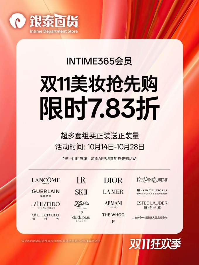 聯(lián)商快訊:10月14日-28日,銀泰百貨開啟一年一度的雙11美妝預(yù)購活動(dòng)。今年首次實(shí)現(xiàn)喵街APP與線下商場(chǎng)同步進(jìn)行,INTIME365會(huì)員在線上線下都可享7.83折預(yù)購優(yōu)惠。