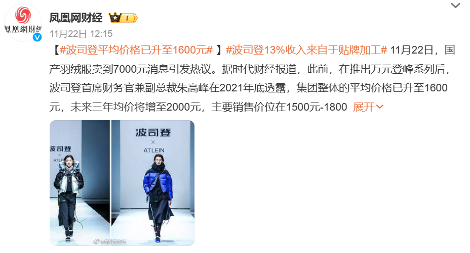 2023年冬天,#波司登均價突破1600元#的話題沖上微博熱搜,讓越來越多人們注意到這個老牌羽絨服巨頭的高端化轉(zhuǎn)型。彼時,波司登最高端的產(chǎn)品價格已經(jīng)達到上萬元一件。