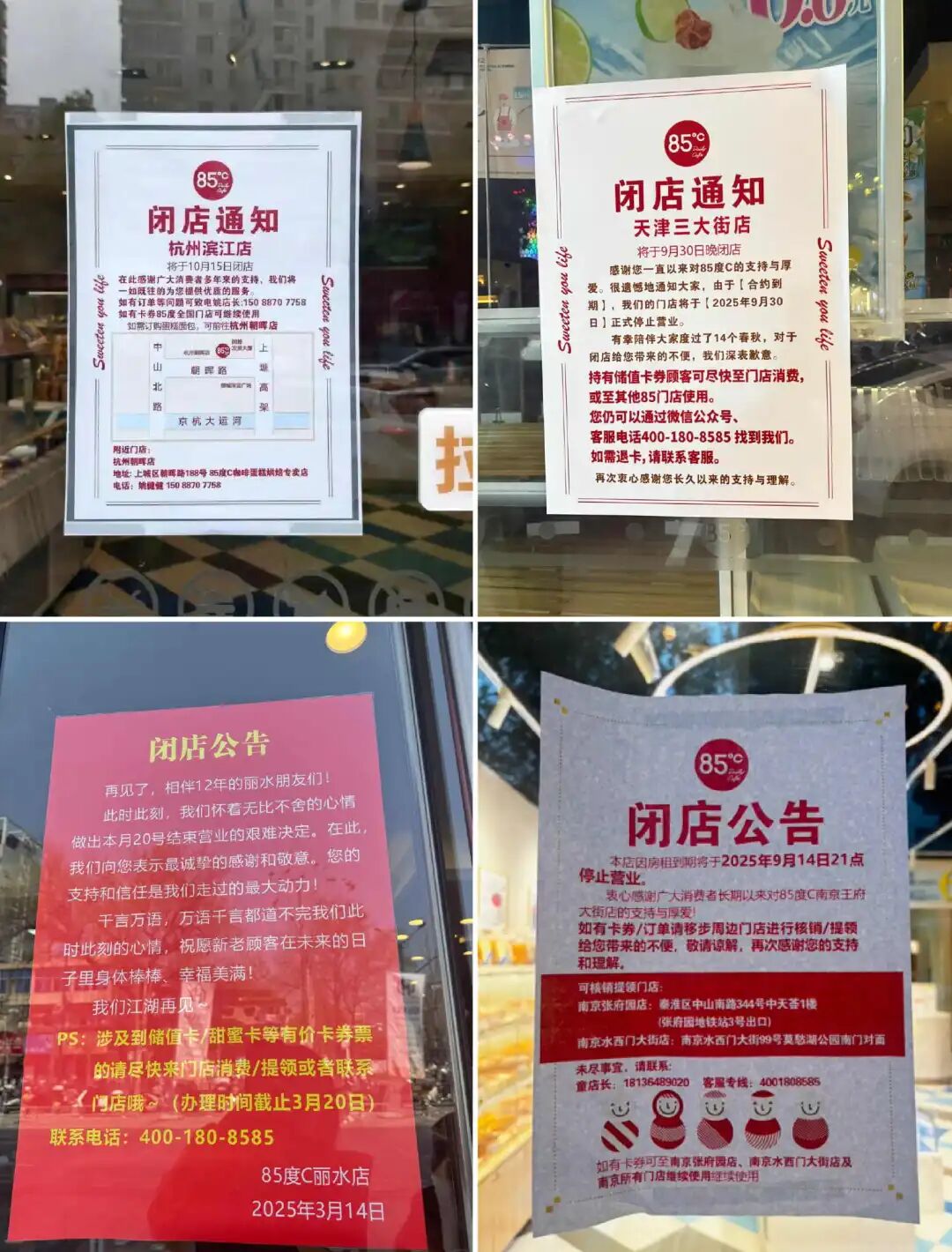 在杭州,開了十多年的85度C慶春店已人去樓空,門店招牌被撤下,店內(nèi)桌椅也被搬運一空,門口玻璃上貼著閉店公告,顯示該店已于9月18日停止營業(yè)。此外,85度C位于杭州的江城路店、富陽玉長城店也都在近期相繼關(guān)閉,濱江店也貼出公告,宣布將于本月15日閉店。