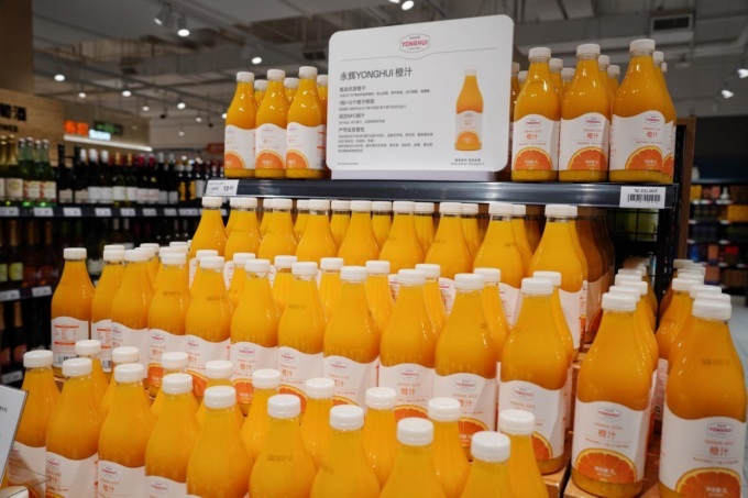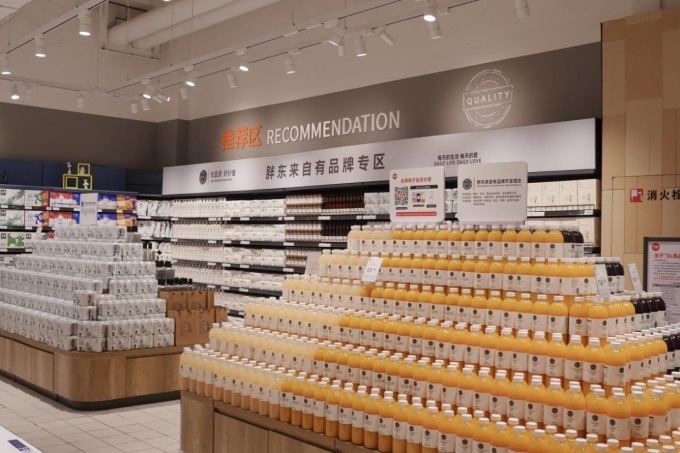 在品質(zhì)升級層面,門店專門設(shè)立了胖東來自有品牌專區(qū),集中展示DL精釀啤酒、DL燕麥片、DL復合果汁、DL自由愛白酒等近70支爆火單品。永輝自有品牌商品同樣表現(xiàn)突出,19.8元/3kg的“微膠囊香氛酵素洗衣液”實現(xiàn)72小時留香和99%除菌除螨率;經(jīng)過439道安全關(guān)卡的新鮮橙汁1L僅售13.5元;精選于東北核心產(chǎn)區(qū)的東北長粒香大米5kg售價37.9元;7.9元/950ml的伊利定制鮮牛奶選用GAP一級認證牧場奶源,體細胞數(shù)及菌落總數(shù)嚴于歐盟標準,成為永輝“優(yōu)質(zhì)平價”戰(zhàn)略的生動注腳。