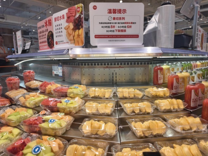 生鮮板塊的變革尤為深刻。水果區(qū)精準開發(fā)民生剛需、特色差異與年輕潮流三類商品,在保留共性商品的同時,新增了果切、冷萃茶、水果撈等輕食新品,通過色彩與場景化陳列,滲透年輕客群的社交、通勤與輕食生活。