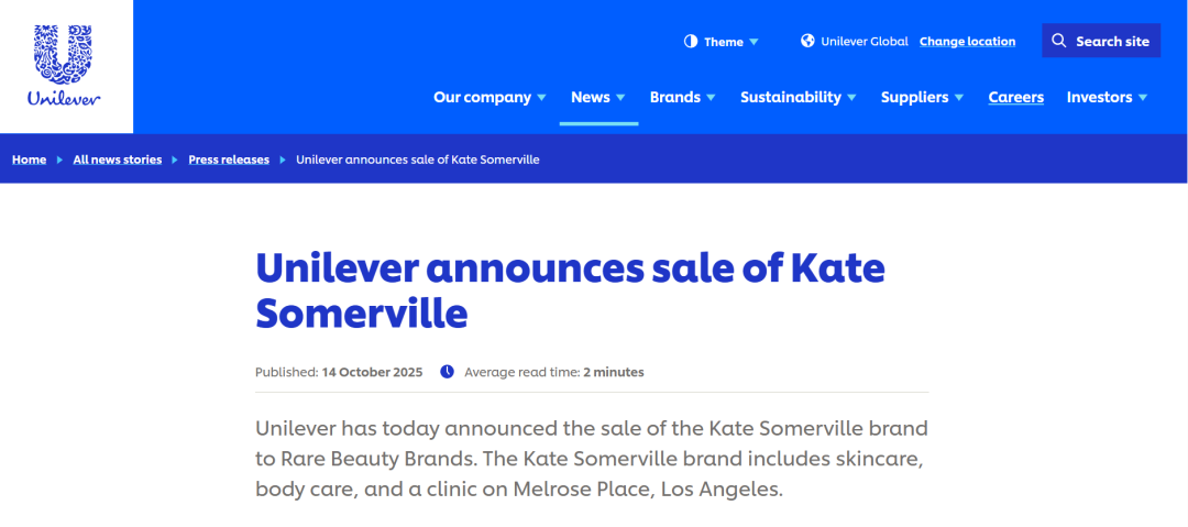 日前(10月15日),聯(lián)合利華在其官網(wǎng)宣布,正在將凱詩(shī)薇出售給獨(dú)立美容品牌孵化公司Rare Beauty Brands,交易預(yù)計(jì)將于2025年第四季度完成,具體交易金額暫未披露。