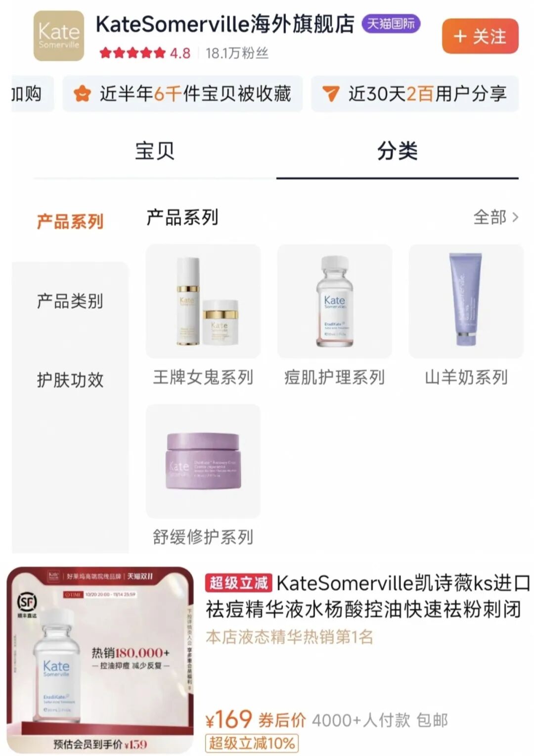 目前,凱詩(shī)薇已入駐全球范圍內(nèi)超2800家絲芙蘭門(mén)店,且在中國(guó)、韓國(guó)、新加坡、澳洲、新西蘭等國(guó)的高端商場(chǎng)內(nèi)設(shè)有專柜。而從線上店鋪來(lái)看,當(dāng)前凱詩(shī)薇天貓海外旗艦店共計(jì)6款產(chǎn)品在售,其中銷量最高的祛痘精華液僅4000+人付款。