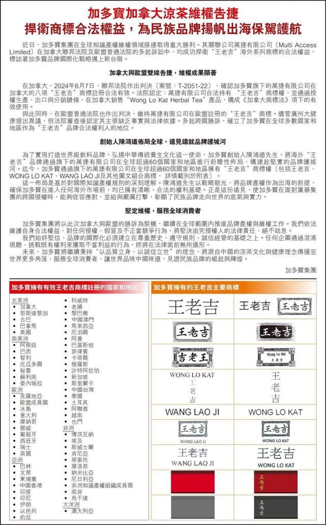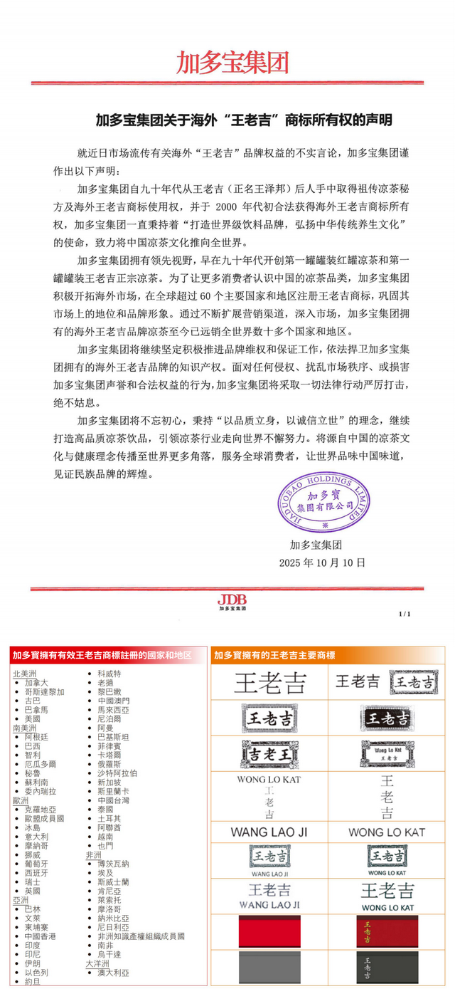 該份聲明中還強調(diào):“王老吉”商標(biāo)所有人為白云山,其歷史沿革資料、知識產(chǎn)權(quán)權(quán)屬的法律文件完整清晰。白云山、王老吉大健康公司在全球100多個國家和地區(qū)完成“王老吉”、“WALOVI”等系列商標(biāo)注冊。通過積極的維權(quán)行動,現(xiàn)已有10個國家/地區(qū)的審理機關(guān)作出撤銷加多寶集團(tuán)注冊的“王老吉”商標(biāo)的決定。