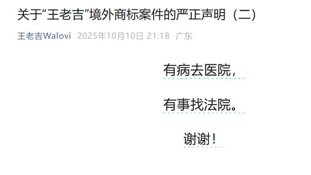 10月10日當(dāng)晚,廣州王老吉就在官方公眾號“王老吉Walovi”發(fā)布了《關(guān)于“王老吉”境外商標(biāo)案件的嚴(yán)正聲明(二)》,文中給予加多寶12字回應(yīng):“有病去醫(yī)院,有事找法院。謝謝!”
