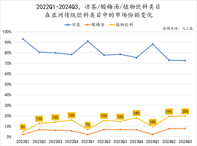 據(jù)馬上贏數(shù)據(jù)統(tǒng)計顯示,冰茶在亞洲傳統(tǒng)飲料類目中的市值份額于2022年一季度達(dá)到峰值,突破了90%,2023年一季度再度觸及90%天花板,2024年Q3數(shù)據(jù)有所下探,不過相較于同賽道中的酸梅湯和植物飲料而言,仍然斷檔領(lǐng)先。