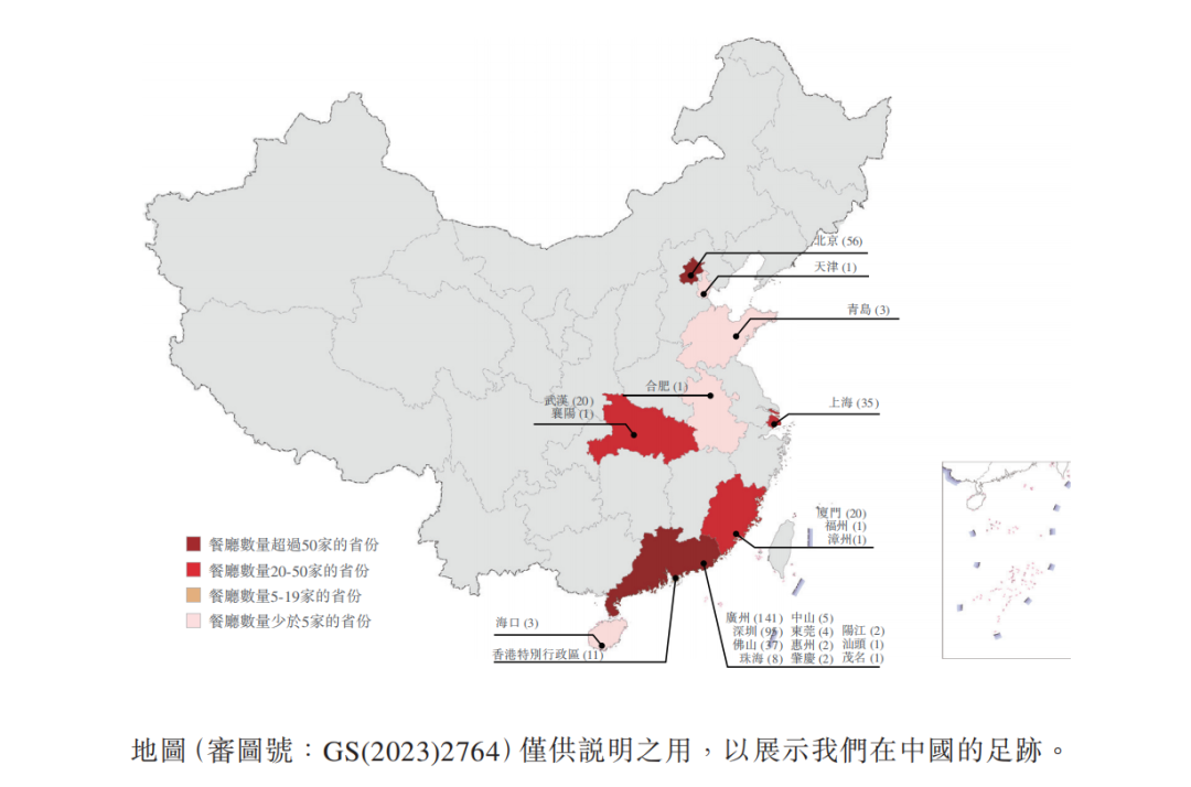 截至最后實(shí)際可行日期(今年10月8日),公司采取直營(yíng)+特許經(jīng)營(yíng)模式,在中國(guó)內(nèi)地22個(gè)城市開設(shè)了440餐廳,并在香港開設(shè)11家餐廳,另有101家新餐廳處于開業(yè)前籌備中。截至今年6月,公司直營(yíng)及特許經(jīng)營(yíng)餐廳合計(jì)417家。