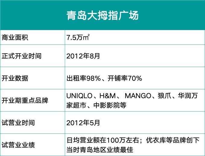 至今猶記大拇指廣場試營業(yè)首日時(shí)的盛況——作為島城首個(gè)大型街區(qū)式商業(yè)綜合體,其不僅集聚了包括優(yōu)衣庫、H&M、無印良品、華潤萬家等一眾熱門品牌,且出租率更是高達(dá)98%。一躍引領(lǐng)當(dāng)時(shí)尚處起步階段的嶗山商圈,好似拉開了嶗山商圈與青島街區(qū)式商業(yè)的時(shí)代序幕。
