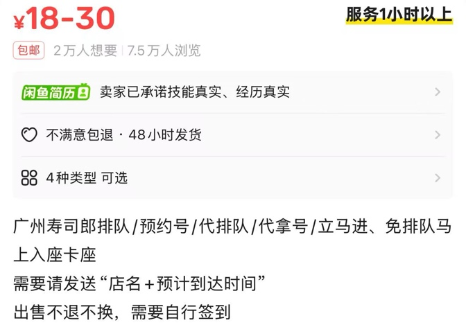 壽司郎愈發(fā)火爆的情況下,排隊(duì)需求自然催生出了黃牛的生意,在一些平臺(tái)上,有賣(mài)家推出壽司郎“代排隊(duì)”“免排隊(duì)”的生意,售價(jià)為數(shù)十元。