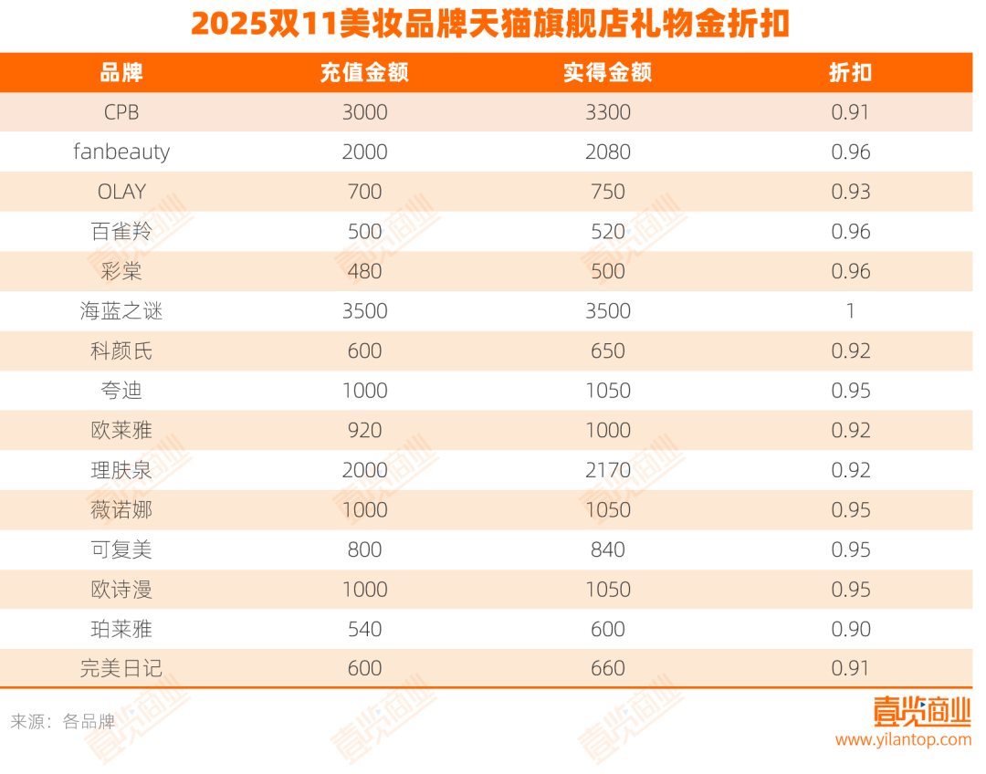 禮物金也是衡量各品牌雙11折扣的另一標(biāo)準(zhǔn)。據(jù)壹覽商業(yè)統(tǒng)計(jì),今年天貓旗艦店的美妝禮物金折扣普遍集中在0.90—0.96區(qū)間。珀萊雅今年力度最大,打出九折禮物金;而海藍(lán)之謎仍然“無(wú)折”,3500充3500,延續(xù)一貫的價(jià)格自信。