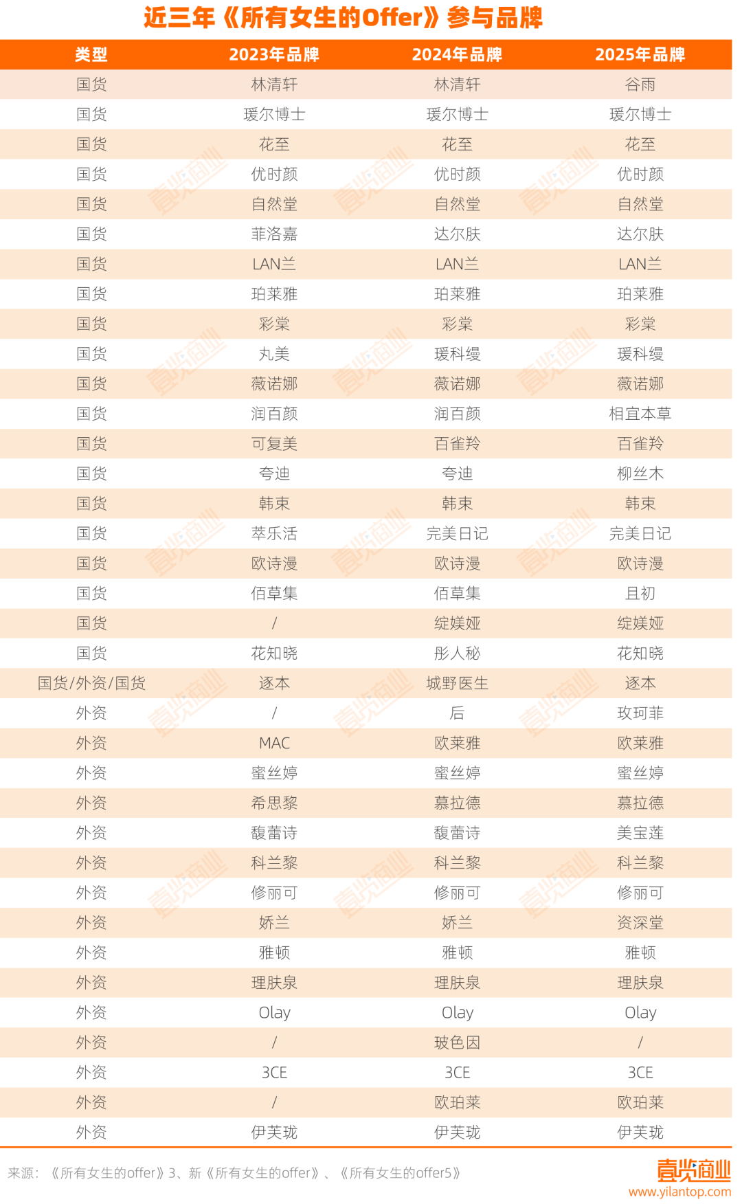 再看國(guó)貨陣容。連續(xù)三年都出現(xiàn)在《所有女生的OFFER》中的國(guó)貨美妝共有十余個(gè),包括珀萊雅、薇諾娜、韓束、歐詩(shī)漫、優(yōu)時(shí)顏、彩棠、自然堂、璦爾博士等。