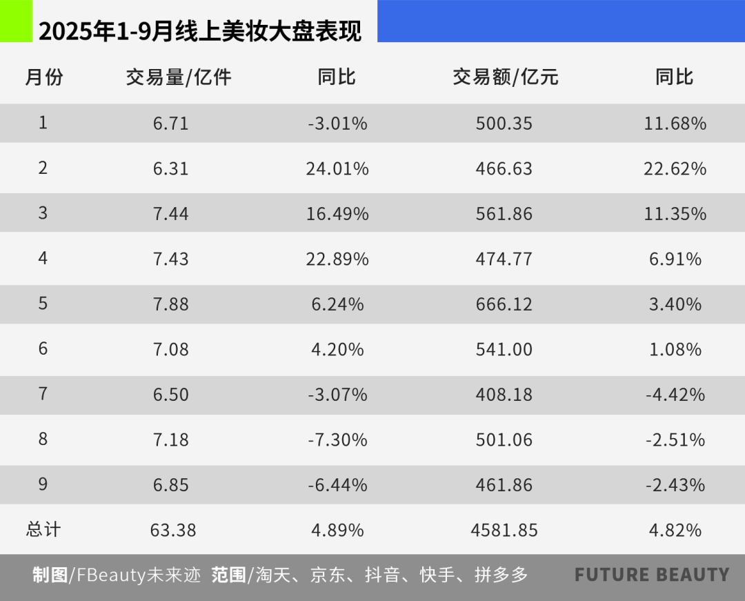 《FBeauty未來跡》獲取到的線上數(shù)據(jù)顯示,今年1-9月全網(wǎng)(淘天、京東、抖音、快手、拼多多)美妝交易總額達(dá)到4582億元,同比增長4.8%;總交易量為63.4億,同比增長4.9%。