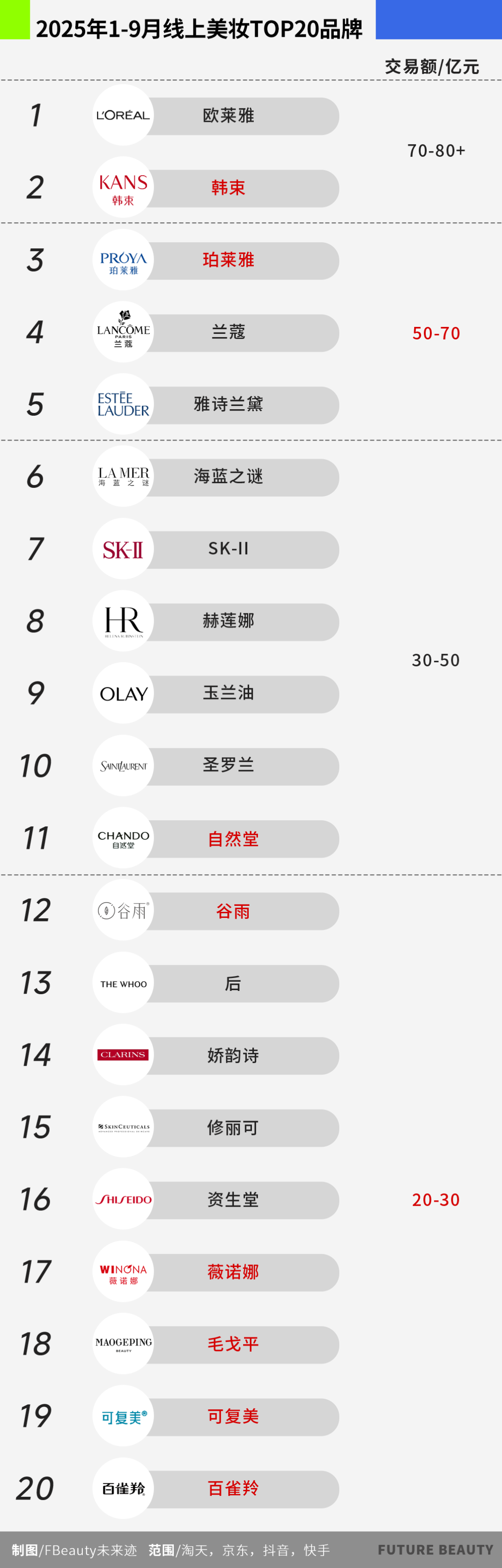 TOP20品牌中,國貨品牌占據(jù)8席,其中百雀羚同比暴漲77.71%,是TOP20品牌中增速最快的選手;此外,毛戈平增長31.29%、韓束躋身TOP2之列。與此同時(shí),赫蓮娜、海藍(lán)之謎、修麗可等高端功效型品牌保持高增長,同比增速均超過10%,印證了市場的高端化與功效化仍是確定性趨勢。