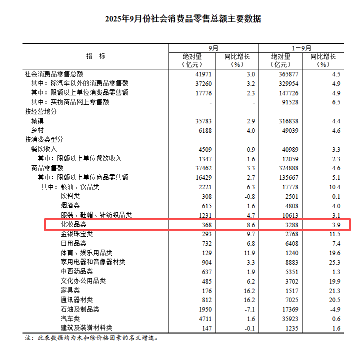 然而,天貓雙11開售的當(dāng)天,國家統(tǒng)計(jì)局公布的數(shù)據(jù)顯示:9月份,社會(huì)消費(fèi)品零售總額同比增長3.0%,其中限額以上化妝品類零售額同比增幅達(dá)到8.6%,不僅顯著高于社零總額增速,也是今年以來單月最高增幅。