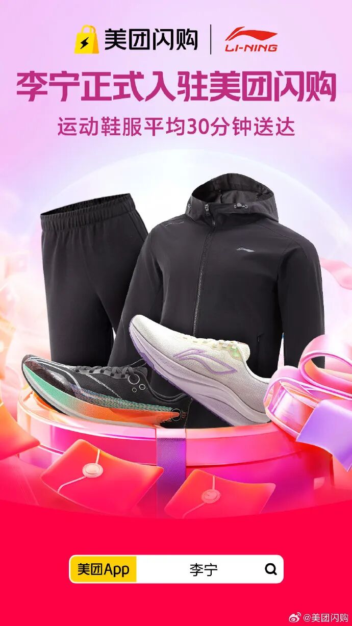 10月20日,美團閃購在微博上官宣了一個新消息:李寧官方正式入駐,全國近百座城市的近千家李寧門店,已同步上線美團閃購。也就是說,現(xiàn)在打開美團App,從跑步、籃球、綜訓(xùn)裝備,到羽毛球、乒乓球、戶外、網(wǎng)球甚至匹克球的服飾和器材,都能直接下單,最快半小時送到家——而且李寧YOUNG的童裝系列也一并上線了。