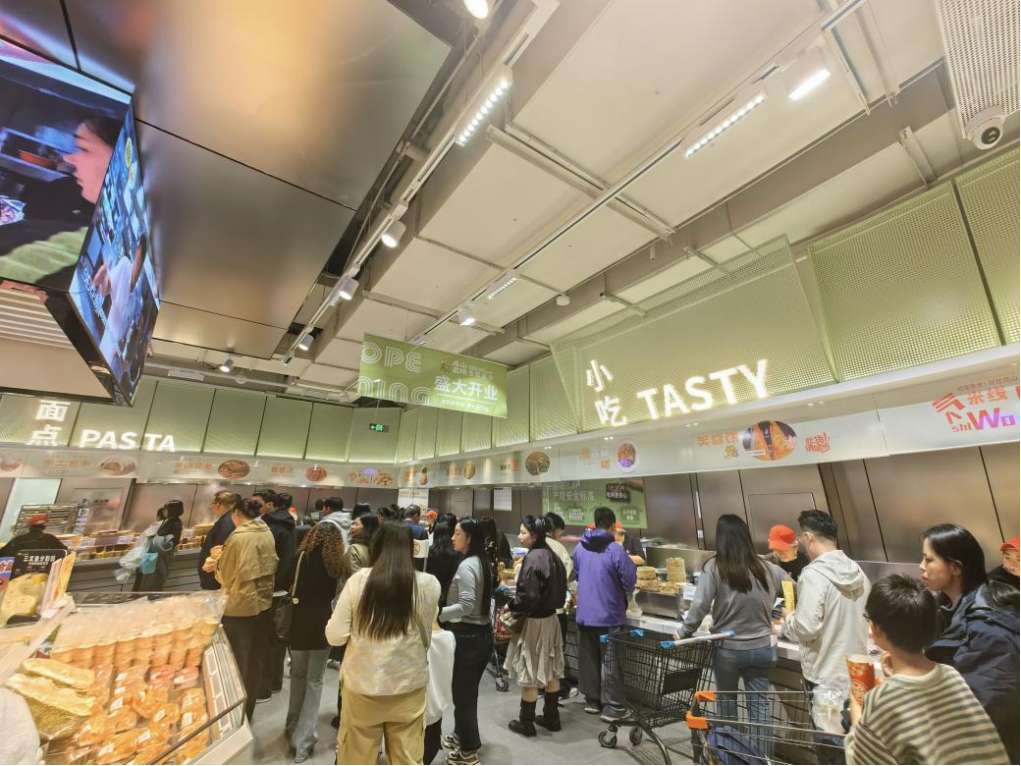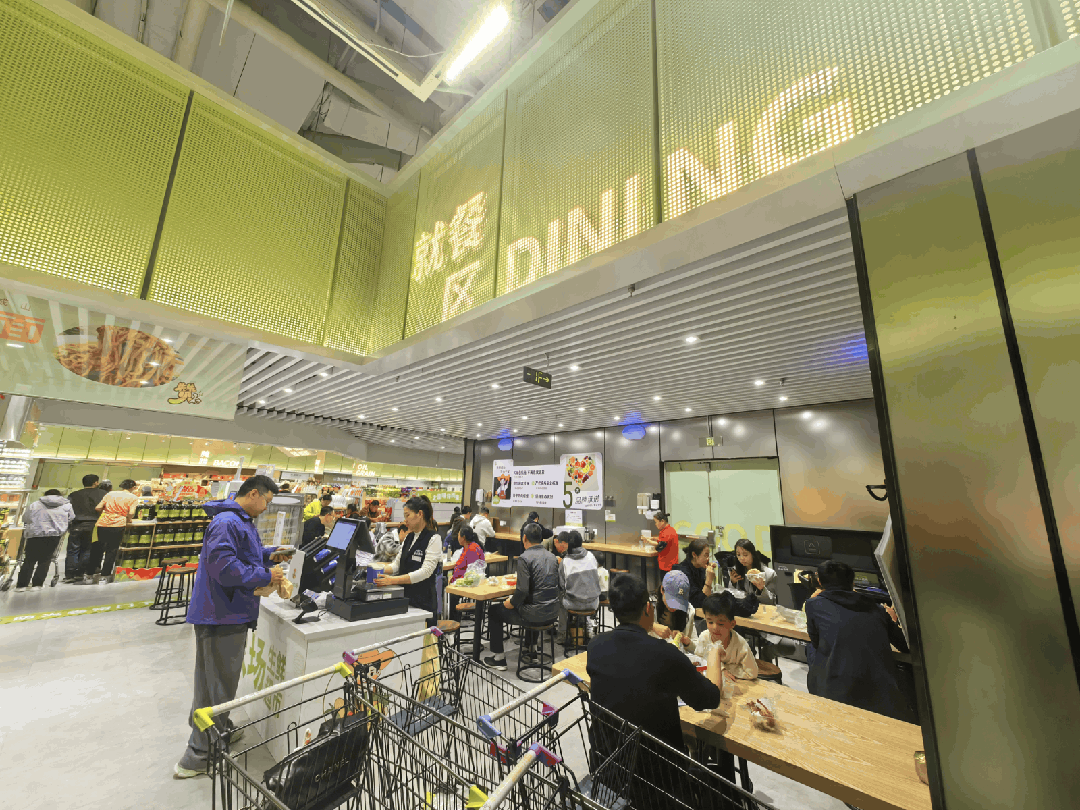 門店以“餐超結(jié)合”的模式,設(shè)置大面積餐飲區(qū),明廚亮灶,所有美食現(xiàn)場(chǎng)制作,讓顧客可清晰地看到食材品質(zhì)與制作全過(guò)程,為居民打造“購(gòu)物+用餐”的一站式服務(wù)場(chǎng)景。