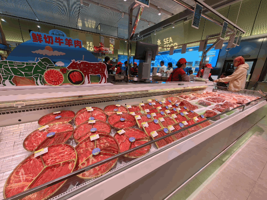 肉品區(qū):牛肉拼盤、各種鮮禽、豬肉部位肉分割精細(xì),專業(yè)水平較高;同時(shí),潮汕南興號(hào)肉丸設(shè)置專區(qū),專人服務(wù)推薦,強(qiáng)化了優(yōu)勢(shì)地理單品心智。