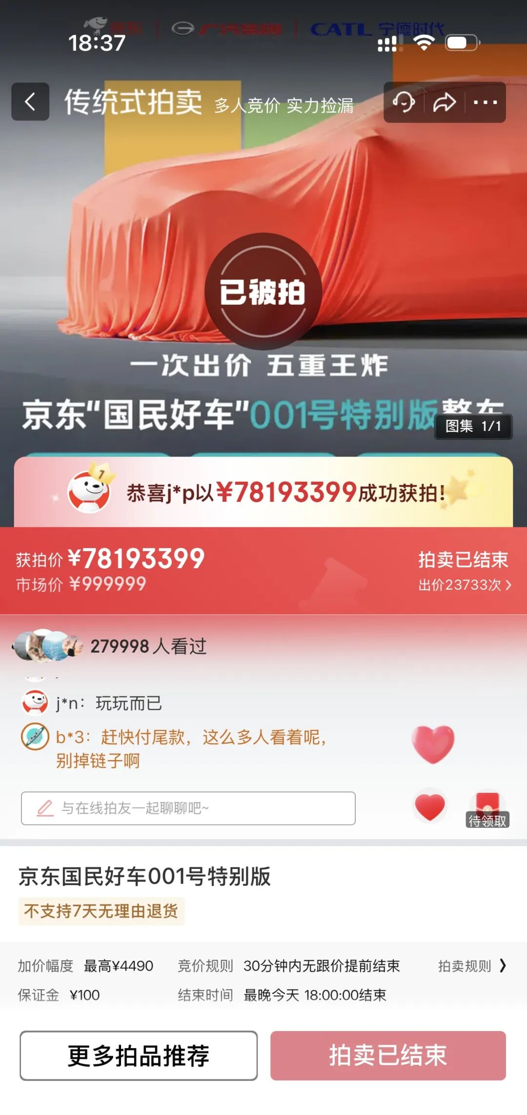 京東“國(guó)民好車(chē)”拍賣(mài),神秘人物出價(jià)7819萬(wàn)
