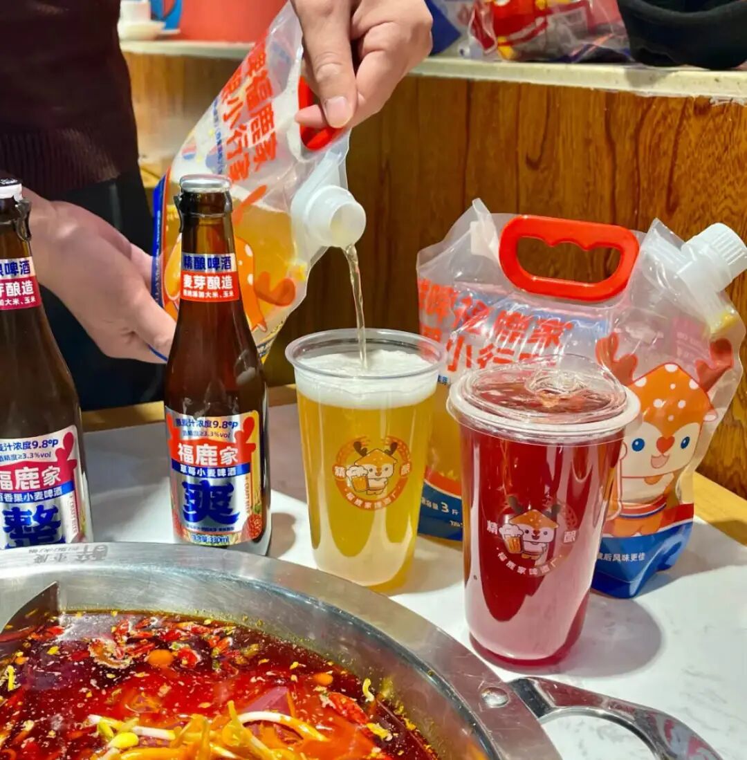 福鹿家顯然想明白了這件事,小甜水才是核心,其他的無論是鮮啤、咖啡還是茶葉,都是包裝。當(dāng)然,小甜水進(jìn)入到鮮啤領(lǐng)域也得進(jìn)行“本地化”改造,份量像一般啤酒一樣按1斤、3斤、5斤售賣,容器除了奶茶杯,還給大份量鮮啤打造了啤酒袋,就連小零食擺出的都是瓜子花生等傳統(tǒng)下酒菜。