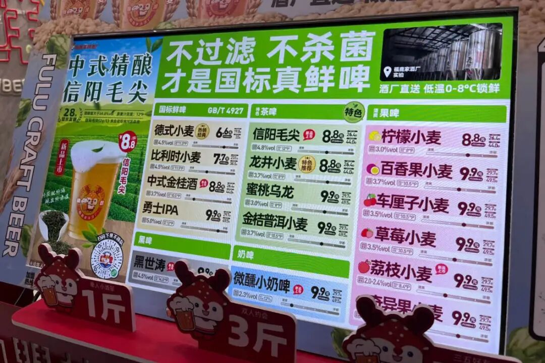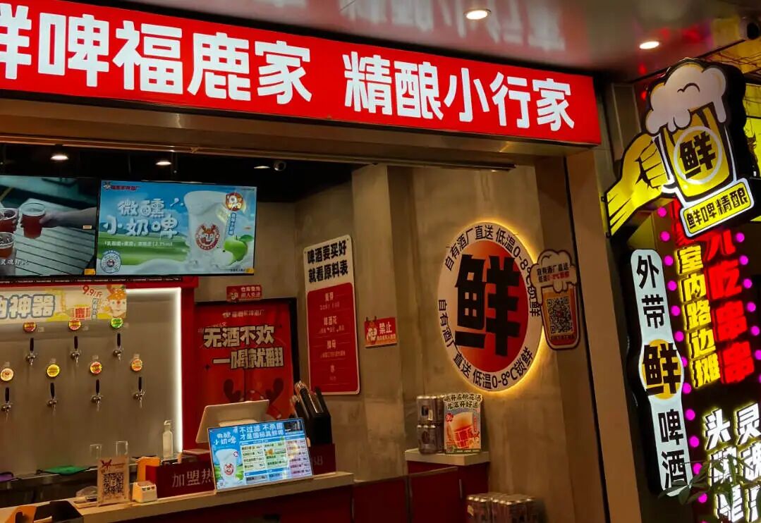 走進(jìn)門店就能看到“鮮啤福鹿家 精釀小行家”的宣傳語,精釀寫在橫幅上、杯子乃至袋子上,而現(xiàn)在,過去的精釀全部被鮮啤代替。
