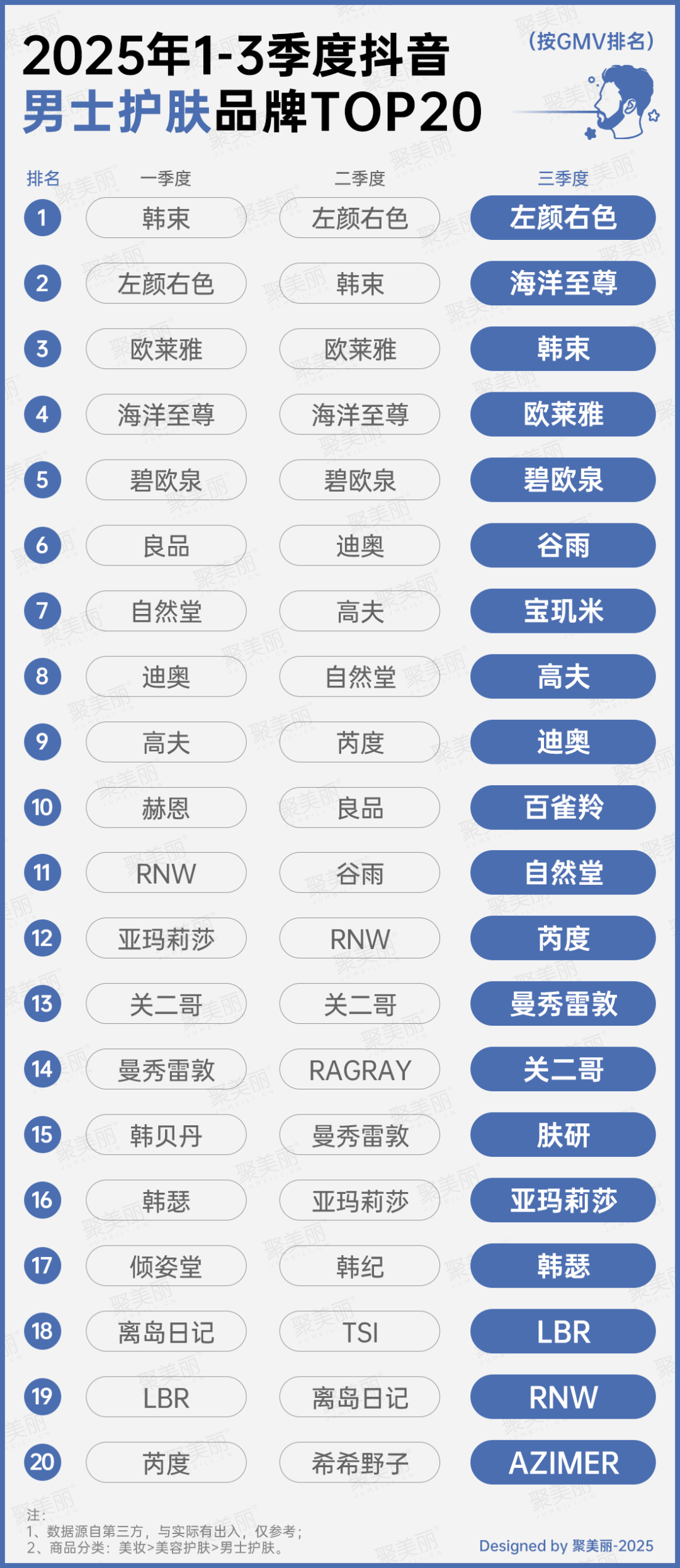 然而,令人意外的是,此前憑借抗老紅蠻腰套裝在抖音霸榜的韓束,竟在一季度登頂男士護(hù)膚TOP1,而二、三季度也穩(wěn)定在前三席位。