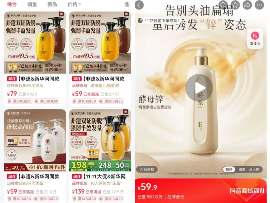 除了赫系之外,長(zhǎng)發(fā)小寨勢(shì)能也在持續(xù)拔高,三季度更是沖進(jìn)TOP1。據(jù)悉,長(zhǎng)發(fā)小寨創(chuàng)立于2018年,理念源自廣西龍勝各族自治縣紅瑤長(zhǎng)發(fā)村的淘米水護(hù)發(fā)傳統(tǒng)。長(zhǎng)發(fā)小寨自2021年進(jìn)駐抖音,2024年起月GMV穩(wěn)定在千萬級(jí),次年7月沖進(jìn)5000W+且持續(xù)保持該體量。其大爆品為防脫輕盈精華液和淘米水洗發(fā)水,季度GMV均千萬級(jí)。目前,長(zhǎng)發(fā)小寨三季度超八成GMV由直播貢獻(xiàn),帶貨上品牌自營(yíng)與達(dá)人推廣并行,新華社、新華網(wǎng)及東方甄選是其主要捆綁的三大賬號(hào)。