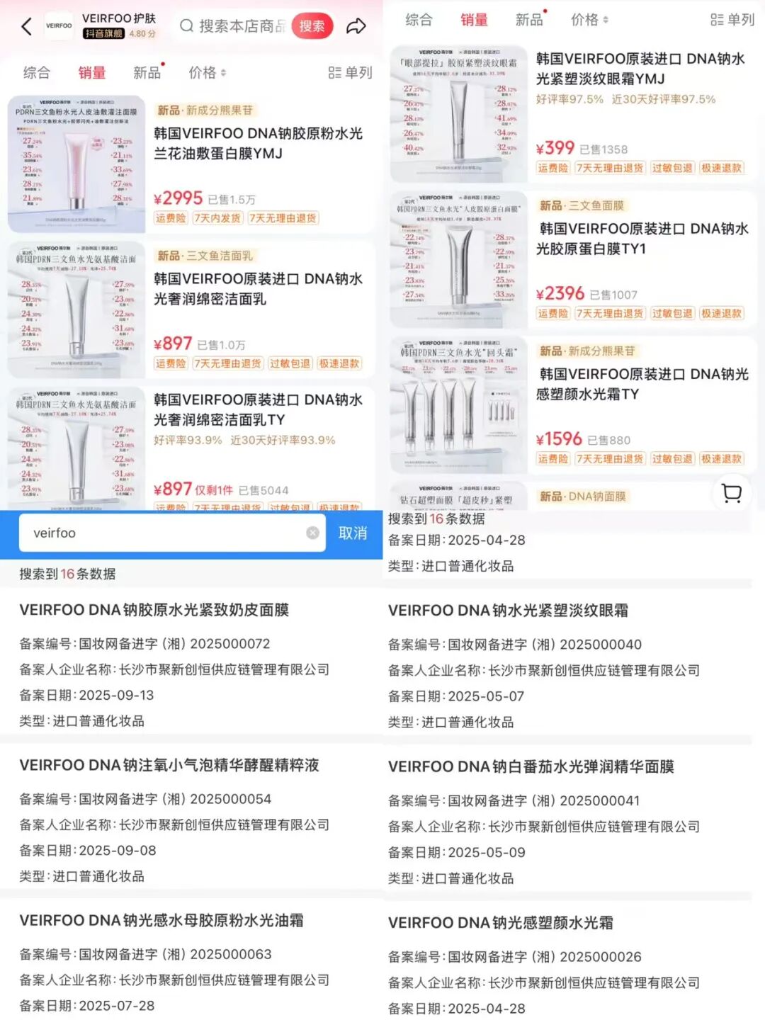 企查查顯示,其商標(biāo)歸屬2024年3月創(chuàng)立的中國(guó)香港藍(lán)沃(環(huán)球)有限公司,但抖音端自稱“韓國(guó)院線尖端科學(xué)美容護(hù)膚品牌”。從化妝品監(jiān)管APP來看,VEIRFOO累計(jì)備案16款產(chǎn)品,首個(gè)產(chǎn)品備案于今年4月,備案方為長(zhǎng)沙市聚新創(chuàng)恒供應(yīng)鏈管理有限公司,生產(chǎn)方為韓國(guó)CNP有限公司。