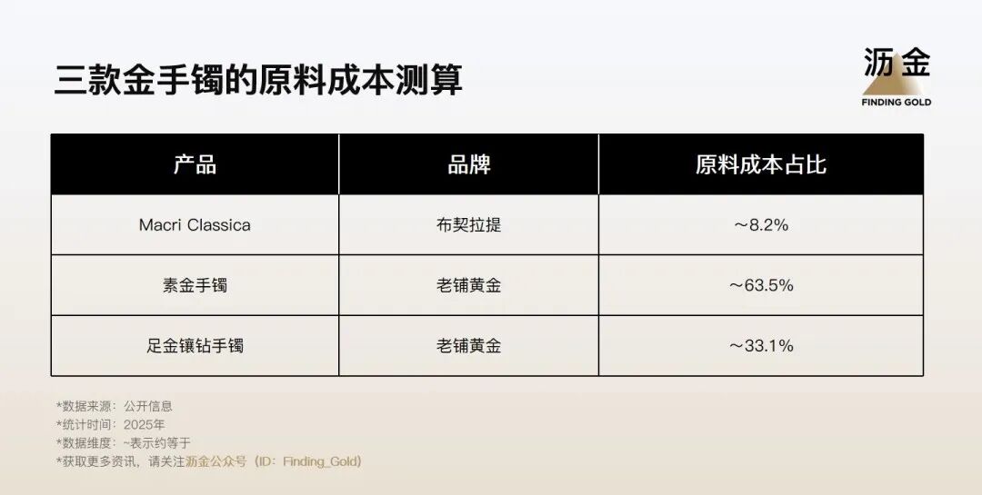 可以看到,老鋪黃金的產(chǎn)品原料成本仍處于30%–65%區(qū)間,顯著高于傳統(tǒng)奢侈品牌單品的10%左右。
