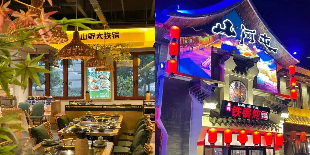與過(guò)去很多鐵鍋燉店不重視門店設(shè)計(jì),多采用紅綠大花布、紅磚墻式的鄉(xiāng)土風(fēng)不同,現(xiàn)在許多鐵鍋燉店不僅開(kāi)在商場(chǎng),裝修也更高級(jí)——寧波有鐵鍋燉店把門店打造成“山野風(fēng)”,整體清新自然;北京一家鐵鍋燉店,把門店打造成“電影秀場(chǎng)”,充滿“賽博朋克”感。
