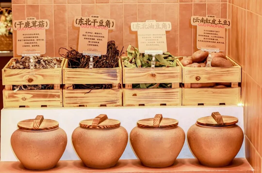另外,過(guò)去的鐵鍋燉店更強(qiáng)調(diào)烹飪方式—“柴火灶”,基本不突出食材,僅用“笨雞笨鵝”等來(lái)進(jìn)行說(shuō)明。但在現(xiàn)在,“食材溯源” 與“新鮮現(xiàn)燉”成了不少門店的 “視覺(jué)亮點(diǎn)”,很多門店不僅會(huì)在門口或明檔區(qū)強(qiáng)調(diào)“現(xiàn)燉”以及標(biāo)注“每一只鵝都來(lái)自哈爾濱”“黑龍江食材”等,像鍋飄飄等還直接將鹿茸菇、干豆角和油豆角等東北食材放在店門口展示,以此來(lái)強(qiáng)化 “正宗” 認(rèn)知。