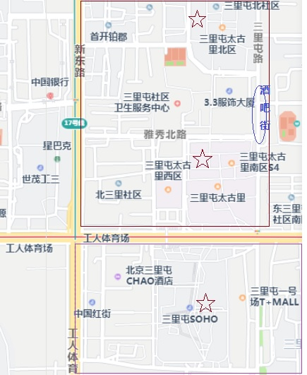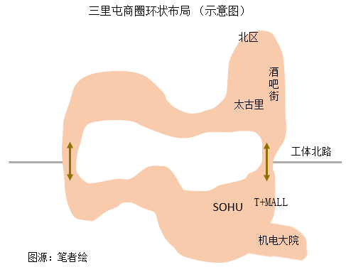 從局部地圖上看,以東西走向的工體北路為界,北部有太古里南區(qū)、西區(qū)、北區(qū)以及3.3服飾大廈、酒吧街、世茂工三、永利國際等20多座低密度商業(yè)化聚客點;南部有三里屯SOHO、三里屯一號場T+MALL、機(jī)電大院以及中國紅街、工體周邊商業(yè)網(wǎng)點等20多個聚客點。這些商業(yè)網(wǎng)點均可以步行到達(dá),通過工體北路也沒有特別的阻礙,從而構(gòu)成較為理想的環(huán)狀交互商圈動線布局。