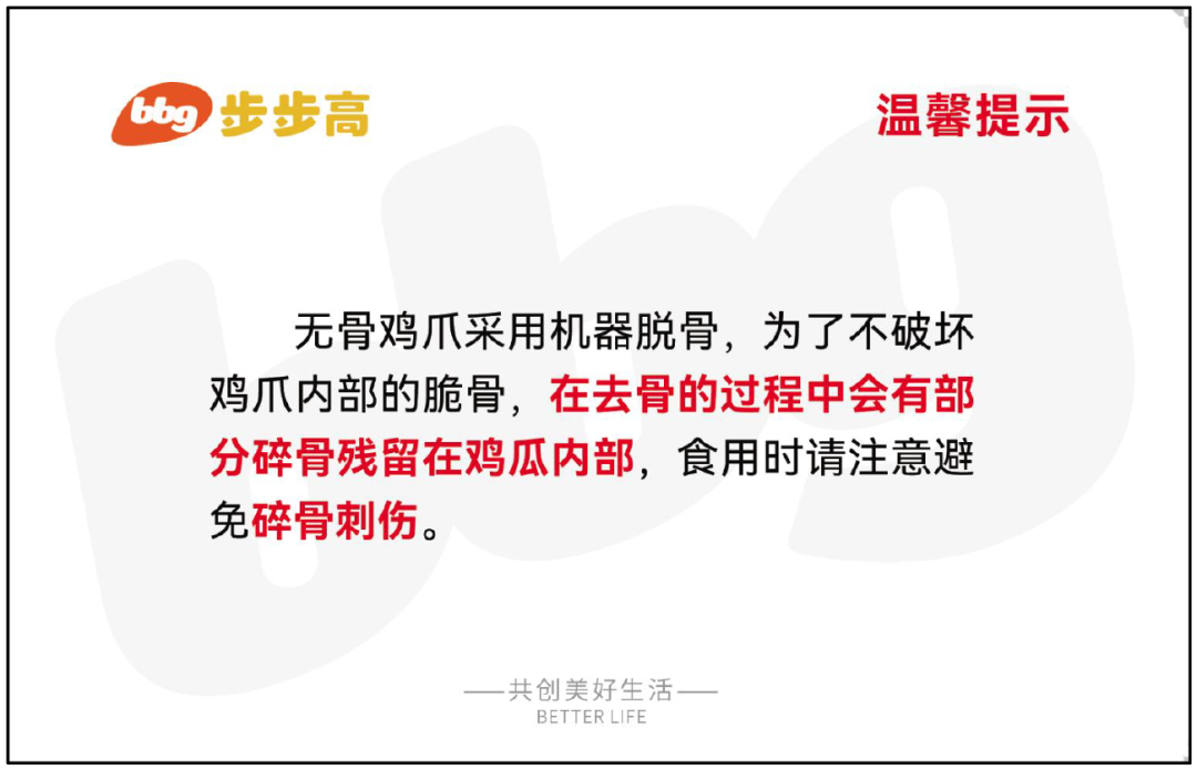 ✔溫馨提示:無(wú)骨雞爪采用機(jī)器脫骨,為了不破壞雞爪內(nèi)部的脆骨,在去骨的過(guò)程中會(huì)有部分碎骨頭殘留在雞爪內(nèi)部,食用時(shí)請(qǐng)注意避免碎骨刺傷。