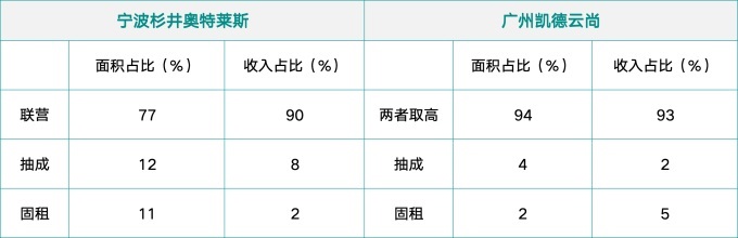 第一,在奧特萊斯經(jīng)營模式中,無論是面積占比還是收入占比,聯(lián)營模式都占絕對的多數(shù);而購物中心因?yàn)槭亲赓U制的,這一項(xiàng)無法直接對比;百貨只能從報(bào)道中推導(dǎo)出結(jié)論。