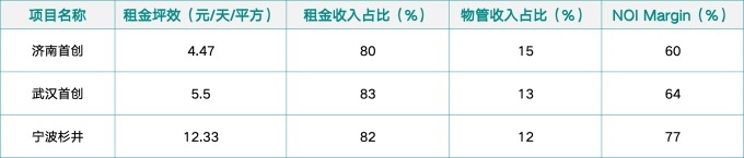 租金坪效已經(jīng)達(dá)到成熟期標(biāo)準(zhǔn),寧波杉井尤為突出,NOI Margin(凈營業(yè)收入邊際,也即凈營業(yè)收入與重資產(chǎn)占比,反映運(yùn)營效率,高值在65-80%)也全部在60%以上。