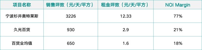 從已經(jīng)發(fā)行了REITs的三個(gè)奧特萊斯項(xiàng)目的租金坪效這一最能反映經(jīng)營業(yè)績的指標(biāo)來看: