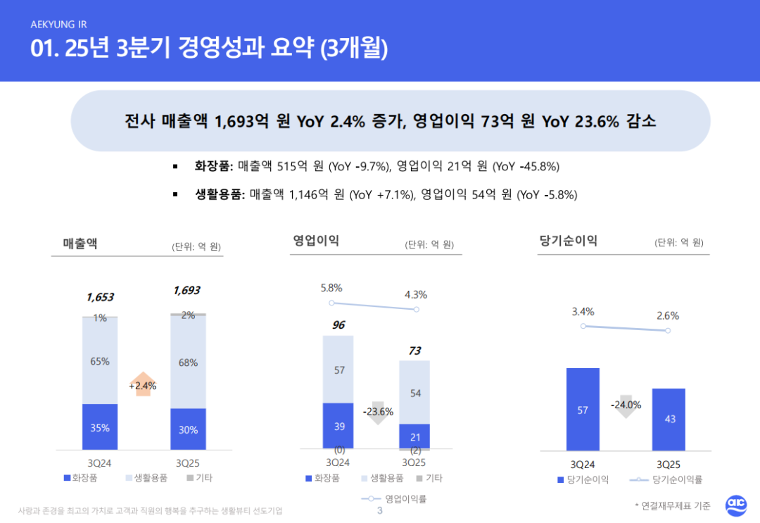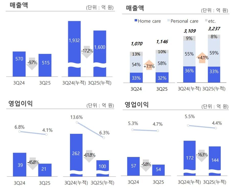 在2025年Q3,愛敬旗下美容業(yè)務(wù)營收為515億韓元(約合人民幣2.55億元),同比下滑9.7%,營業(yè)利潤為21億韓元(約合人民幣0.10億元),同比大跌45.8%。