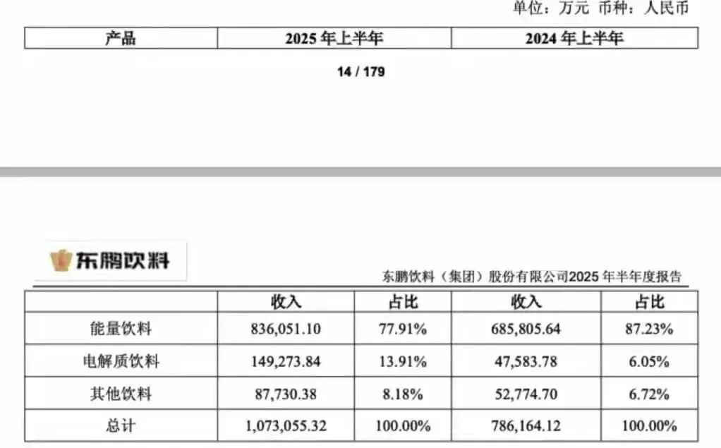 放大來看,據(jù)公開財(cái)報(bào)資料,2025年上半年,以東鵬特飲為主的能量飲料收入約83.60億元,占總營(yíng)收的77.91%,上年同期占比為87.23%,1-9月合計(jì)下降為74.63%;“東鵬補(bǔ)水啦”年中收入為14.93億元,同比增長(zhǎng)213.7%,占總收入的比重達(dá)到13.9%,1-9月合計(jì)提升至本年16.91%;其他諸如東鵬大咖、茉莉茶飲等品類合計(jì)占比在年中和前三季度均不足10%。