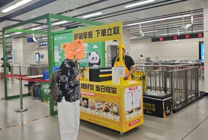 美團在地鐵站推出的“食光機”項目,以餐車和自提柜兩種形態(tài)嵌入地鐵站,消費者既可以通過小程序提前預約,到站憑碼自取,也可以現(xiàn)場掃碼即時購買。通過預訂量和算法預測,美團提前向合作商家批量下單,商家當日現(xiàn)做并統(tǒng)一打包,再由騎手批量配送到各個站點。這種模式將原本碎片化、成本高昂的逐單履約,轉(zhuǎn)化為標準化、可控的集中供給。