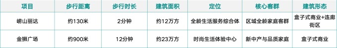 該項(xiàng)目1公里內(nèi)的主要競(jìng)品為嶗山麗達(dá)與金獅廣場(chǎng),兩者均為城/區(qū)級(jí)標(biāo)桿項(xiàng)目,且嶗山麗達(dá)與該項(xiàng)目步行距離僅約130米,形成“隔街相望”的貼身肉搏之勢(shì)。故在未能有效吸引域外客群的情況下,競(jìng)爭(zhēng)本質(zhì)為零和博弈;加之該項(xiàng)目建筑面積僅約2.5萬(wàn)方,分別為嶗山麗達(dá)的20.8%、金獅廣場(chǎng)的10.9%,若未形成高度差異化特色,則幾無(wú)立足空間。