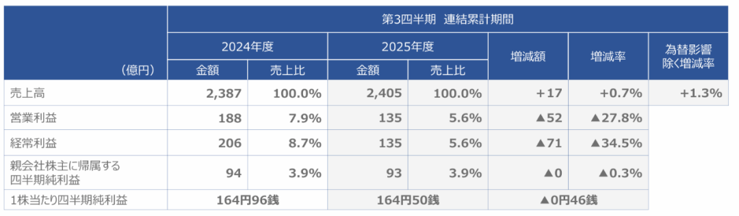 報告期內(nèi),營業(yè)利潤下降27.8%至135億日元(人民幣約6.23億元),主要因銷售管理費用增加導(dǎo)致利潤下降。