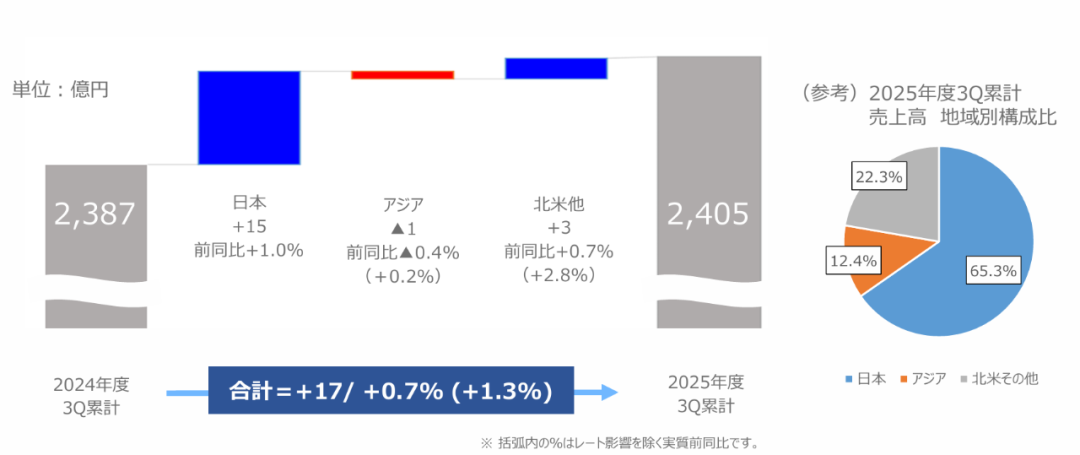 其中,北美地區(qū)凈銷售額為535億日元(人民幣約24.7億元),同比上漲3%,占比22.3%。