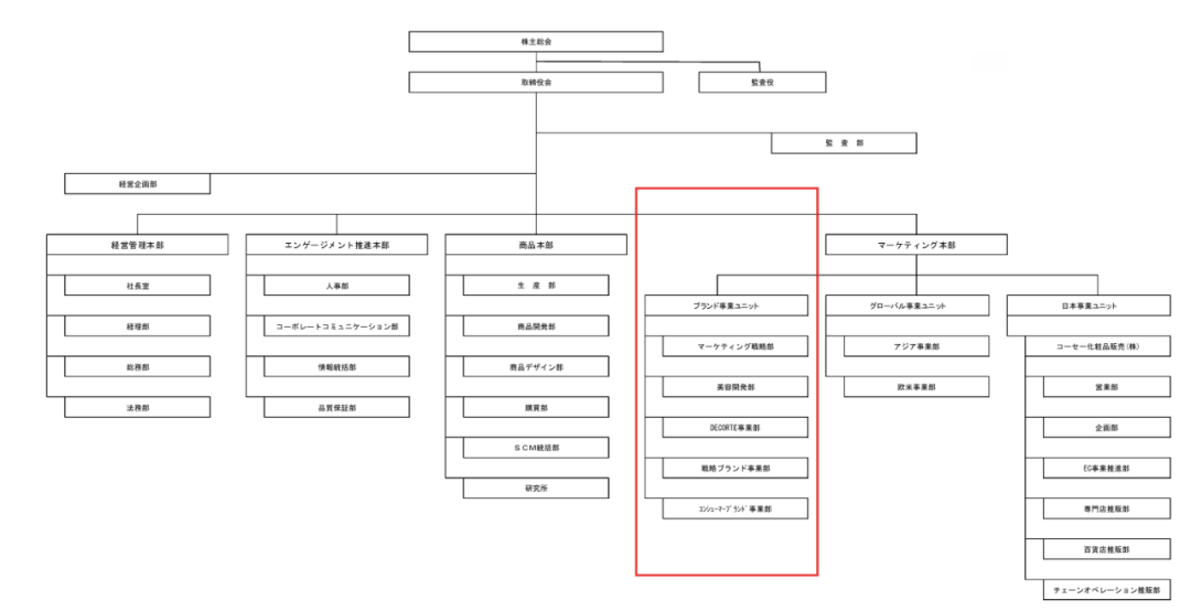 其次,在2026年1月1日起開始實行的新株式會社高絲組織結(jié)構(gòu)圖中,品牌事業(yè)部共設(shè)5個部門,分別為營銷戰(zhàn)略部、美容開發(fā)部、DECORTé事業(yè)部、戰(zhàn)略品牌事業(yè)部、消費品品牌事業(yè)部。