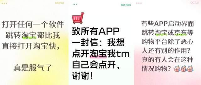 比如小紅書平臺上,就不乏調(diào)侃,甚至有網(wǎng)友給所有APP一封信:“我想點開我**自會點開,謝謝!”,“有些APP啟動界面跳轉(zhuǎn)淘寶或京東等購物平臺除了惡心人還有別的作用?……”