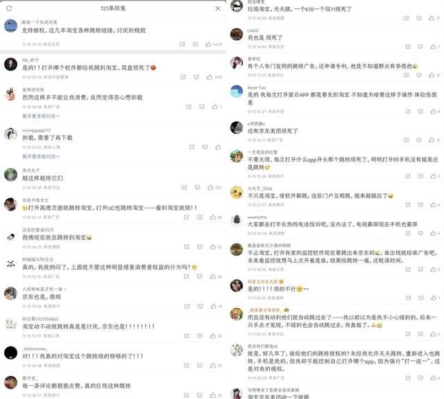 值得一提的是,在劉嘉玲微博的評論區(qū),還有多條熱評及跟評指向“各種跳轉(zhuǎn)鏈接,討厭到極致”、“離譜,每打開一個app就強行跳到淘寶,煩死了,這廣告”、“京東也是”等現(xiàn)象,引發(fā)了大量網(wǎng)友的共鳴…